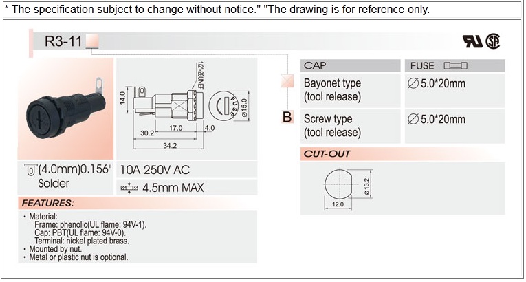Fuse holder; tube fuses; 5x20mm; 10A; Mounting: on panel; 250VAC
